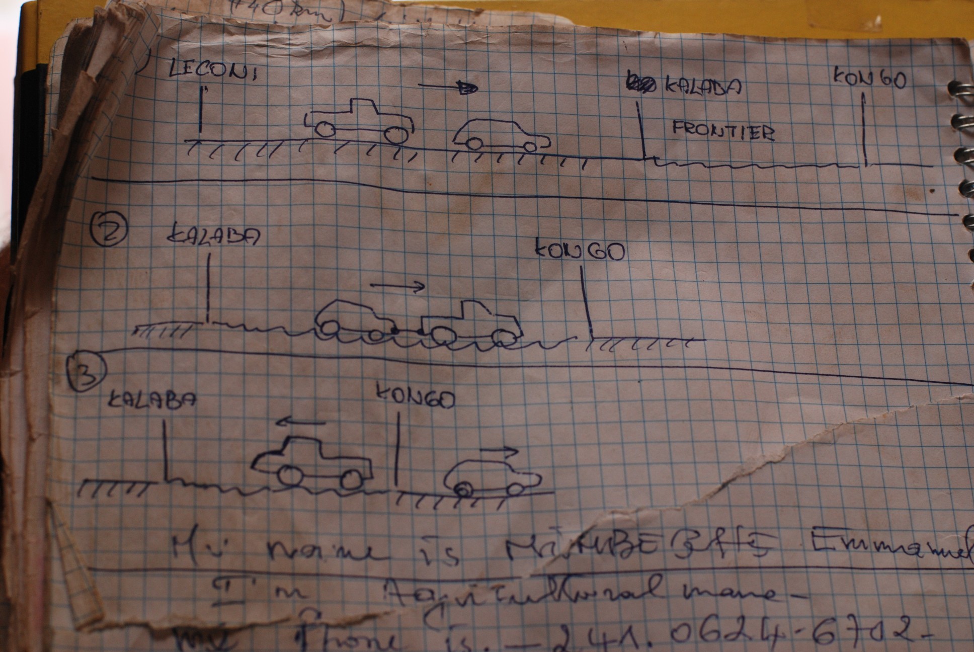 (poznámka: fotky obsahují dva kreslené obrázky. První je popis pomoci, kterou jsme potřebovali pro překonání písečných hranic do Konžské republiky. Nikdo to asi nechtěl pochopit. Druhý obrázek si pro porozumění naší cesty zkonstruoval pracovník ambasády Angoly v Libreville v Gabonu. Krásný vývojový diagram naší cesty zaznamenán diplomatem. Prosím všimněte si faxového čísla, které jsem dostali na otázku, kde najdeme ambasádu Angoly v Kinshase. Nakonec jsme mu po vysvětlení, že nemáme fax a potřebujeme adresu, stejně nakonec tomu namyšlenému debilovi poděkovali a odešli středem.)